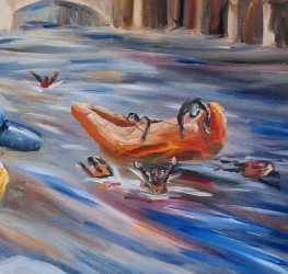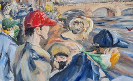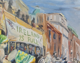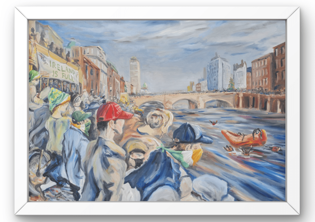 JS Rivera is a recent immigrant to Ireland. His art is influenced by debates around ‘Irishness’ in response to anti-immigrant rhetoric. In this painting, Sorry Jack, modern-day Dubliners watch an imagined Liffey ‘Swim’ performed by asylum seekers. This work is based on Jack B Yeat’s renowned 1923 painting The Liffey Swim.